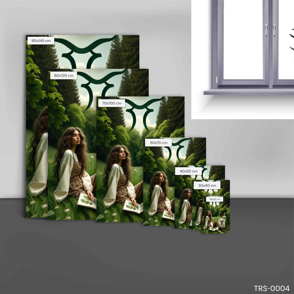 - تجمع اللوحة بين مشهد طبيعي خلاب وتجسيد فني مبدع، حيث تظهر فتاة جميلة تجلس في غابة مزينة بأشجار عالية، مما يعكس اندماجًا رائعًا بين الإنسان والطبيعة.