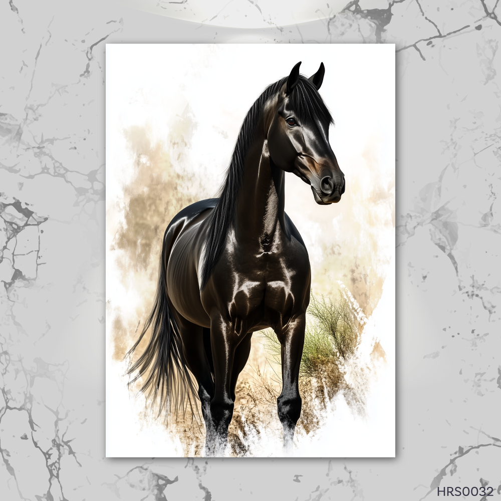 • جمال خلاب يعكس الأناقة والقوة: تجسد اللوحة جمال الخيل العربي الأسود بمهارة فائقة، حيث تبرز تفاصيله المذهلة وألوانه الداكنة بقوة وبهاء، مما يجعلها تحفة فنية تجمع بين الأناقة والقوة.