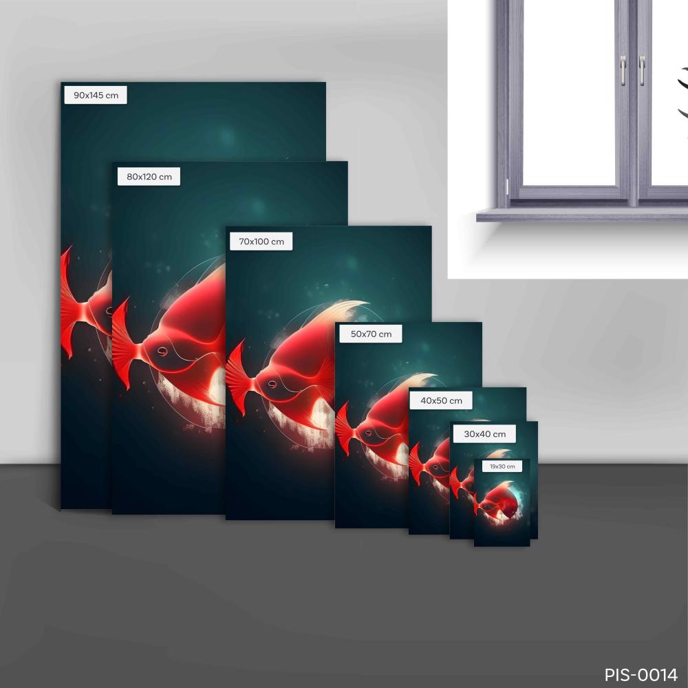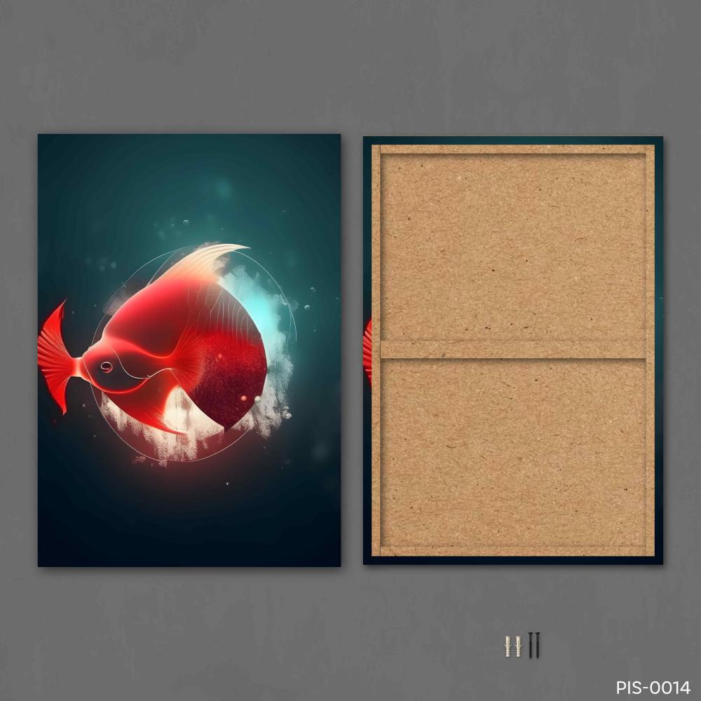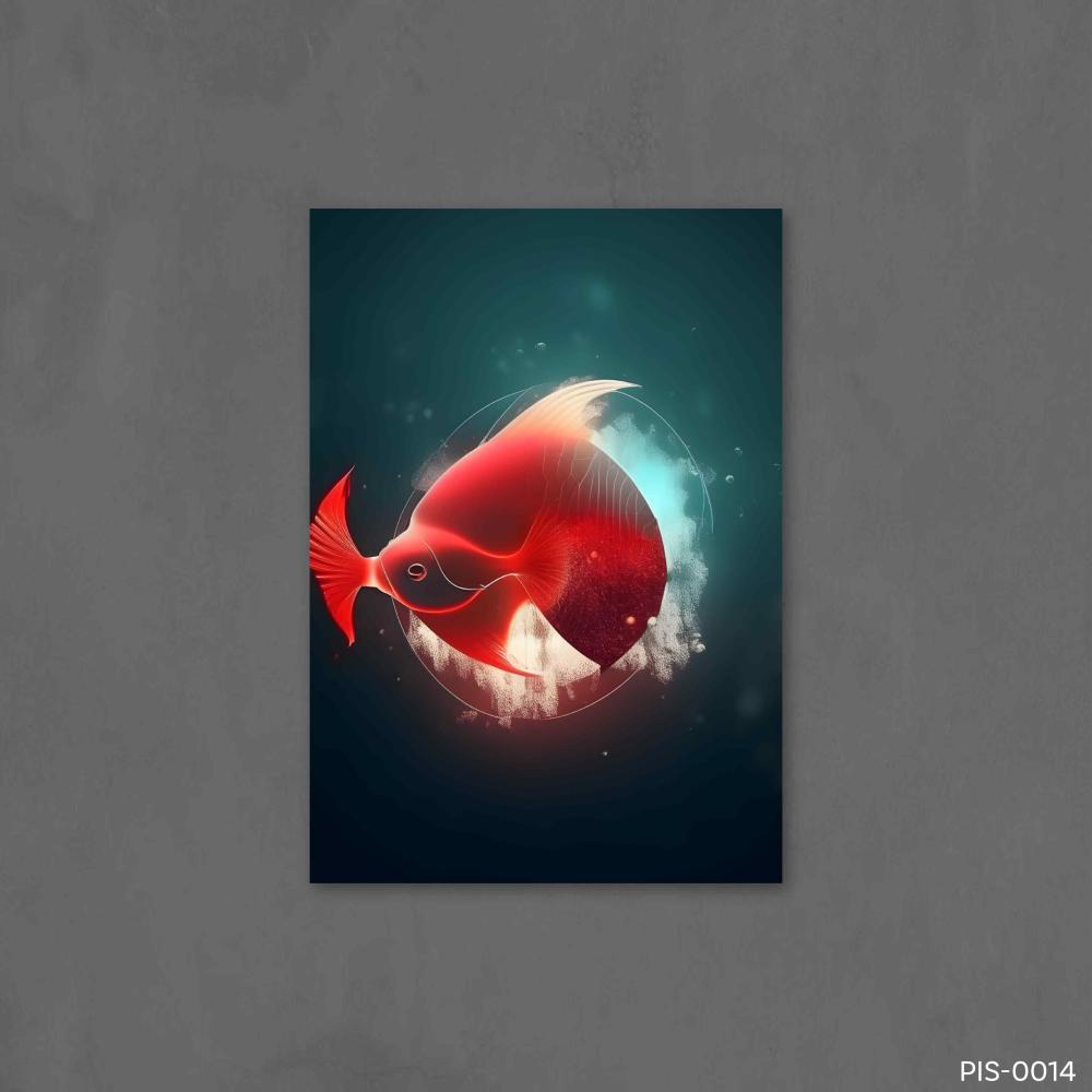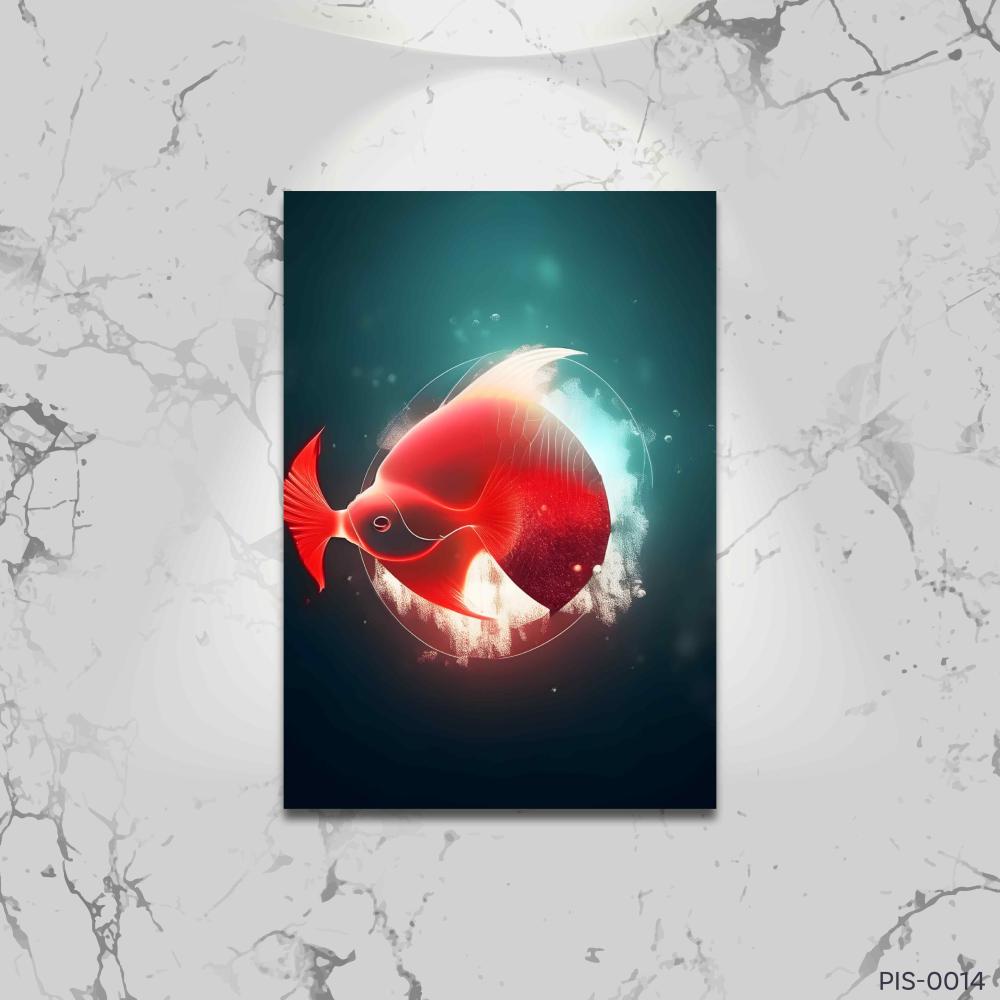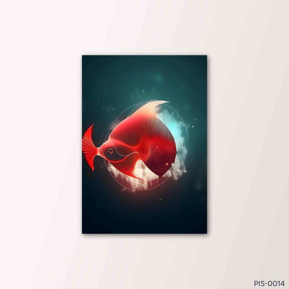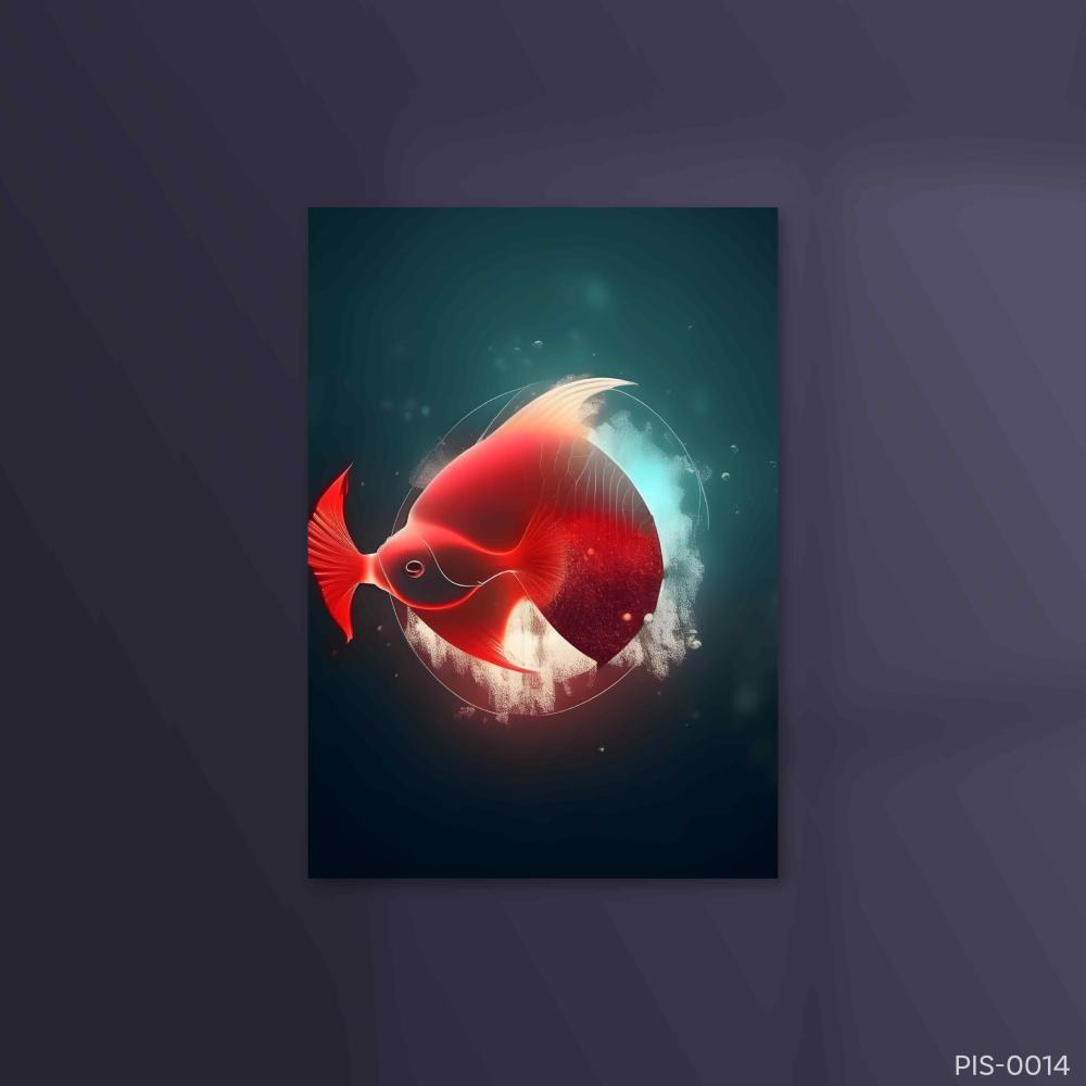 • تجسد اللوحة بداية رحلة برج الحوت بدمج رائع بين سمكة حمراء وقمر قرمزي، مما يعكس الرمزية العميقة والبداية الجديدة.