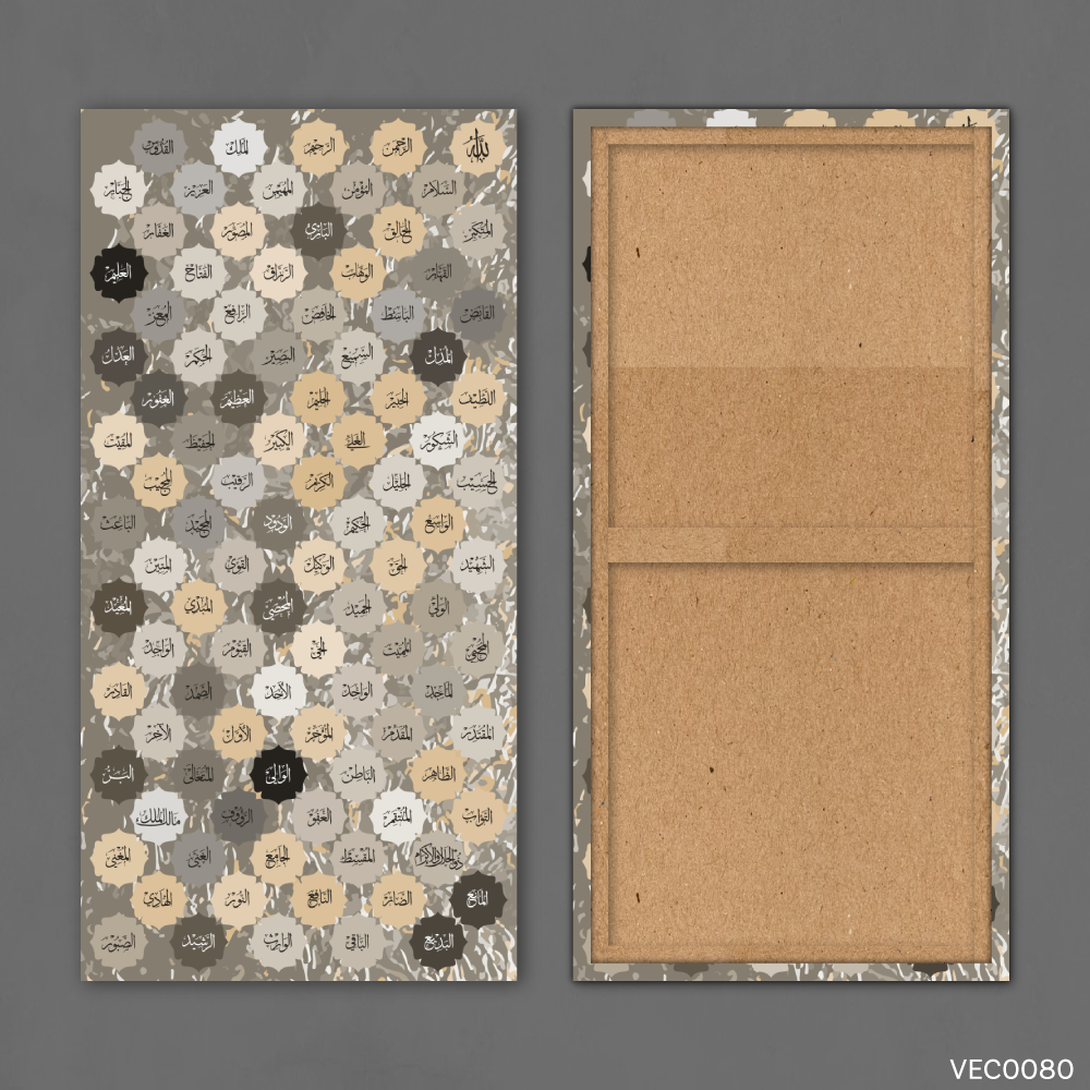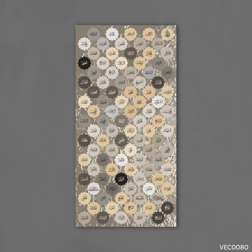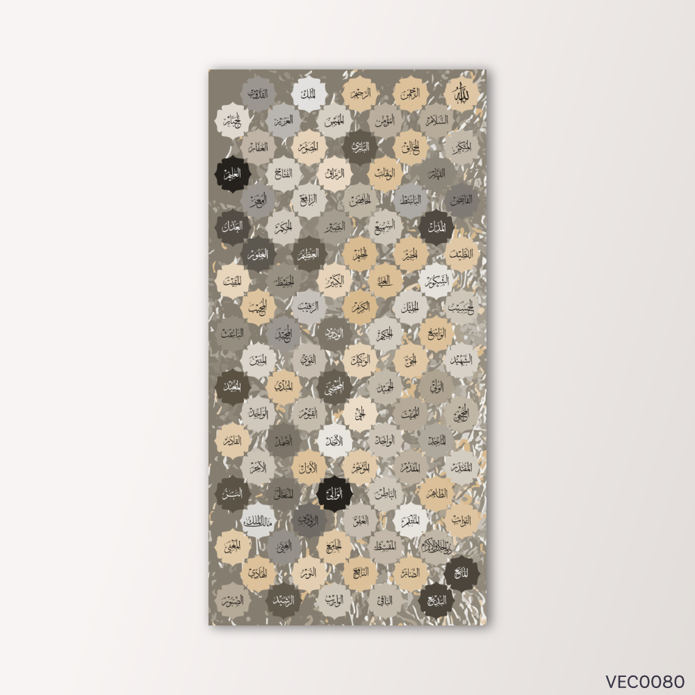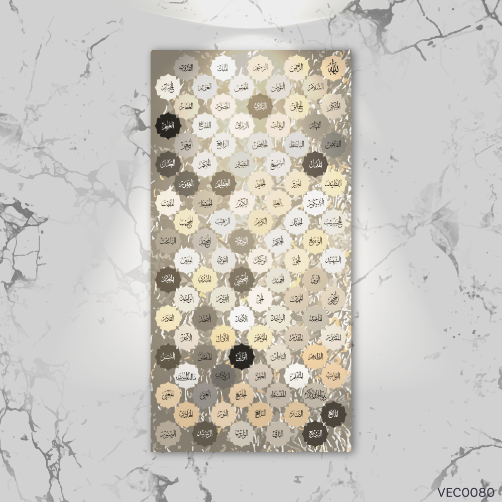 • تحتوي اللوحة على 99 اسمًا من أسماء الله الحسنى، كل اسم مُدون بعناية في حلقة هندسية جميلة، مما يخلق تناغمًا بصريًا رائعًا.