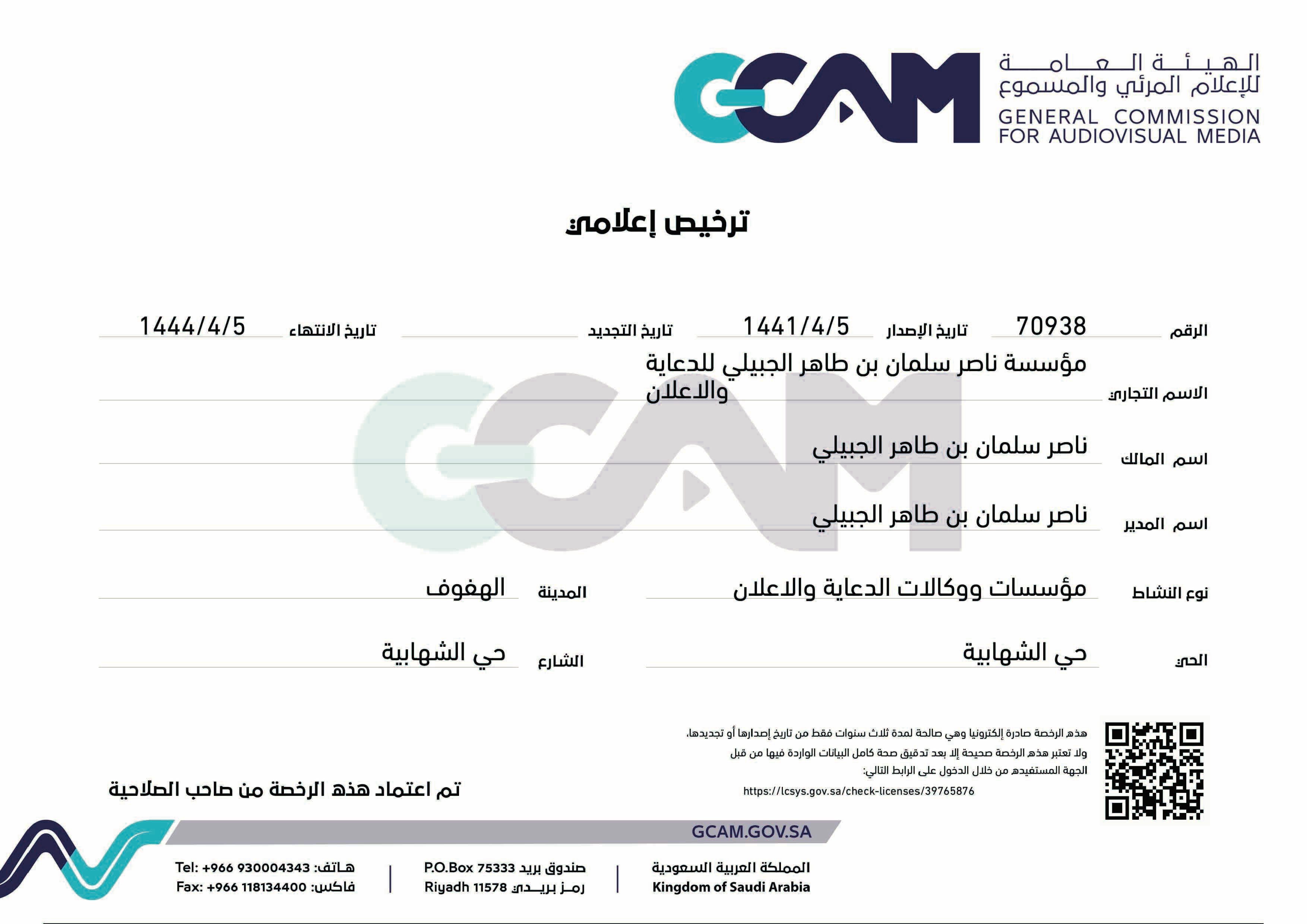 The media license (No. 70938) has been approved by the General Authority for Audiovisual Media for Hot Graphics affiliated to the Nasser Salman bin Taher Al-Jubaili Foundation for Advertising and Publicity, accordingly the license has been listed below: